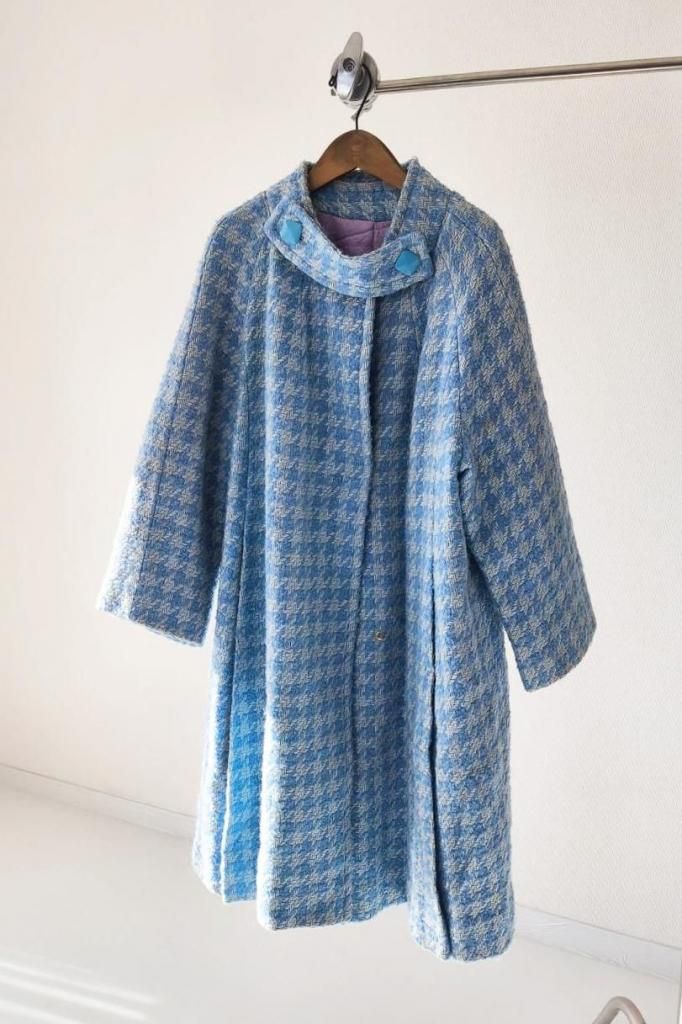 柔らかなライトブルーと、生成りまたは薄いベージュが織りなすヘリンボーン柄のツイード生地が、上品でクラシカルな雰囲気を醸し出しています。ヴィンテージならではの贅沢な生地使いが魅力。